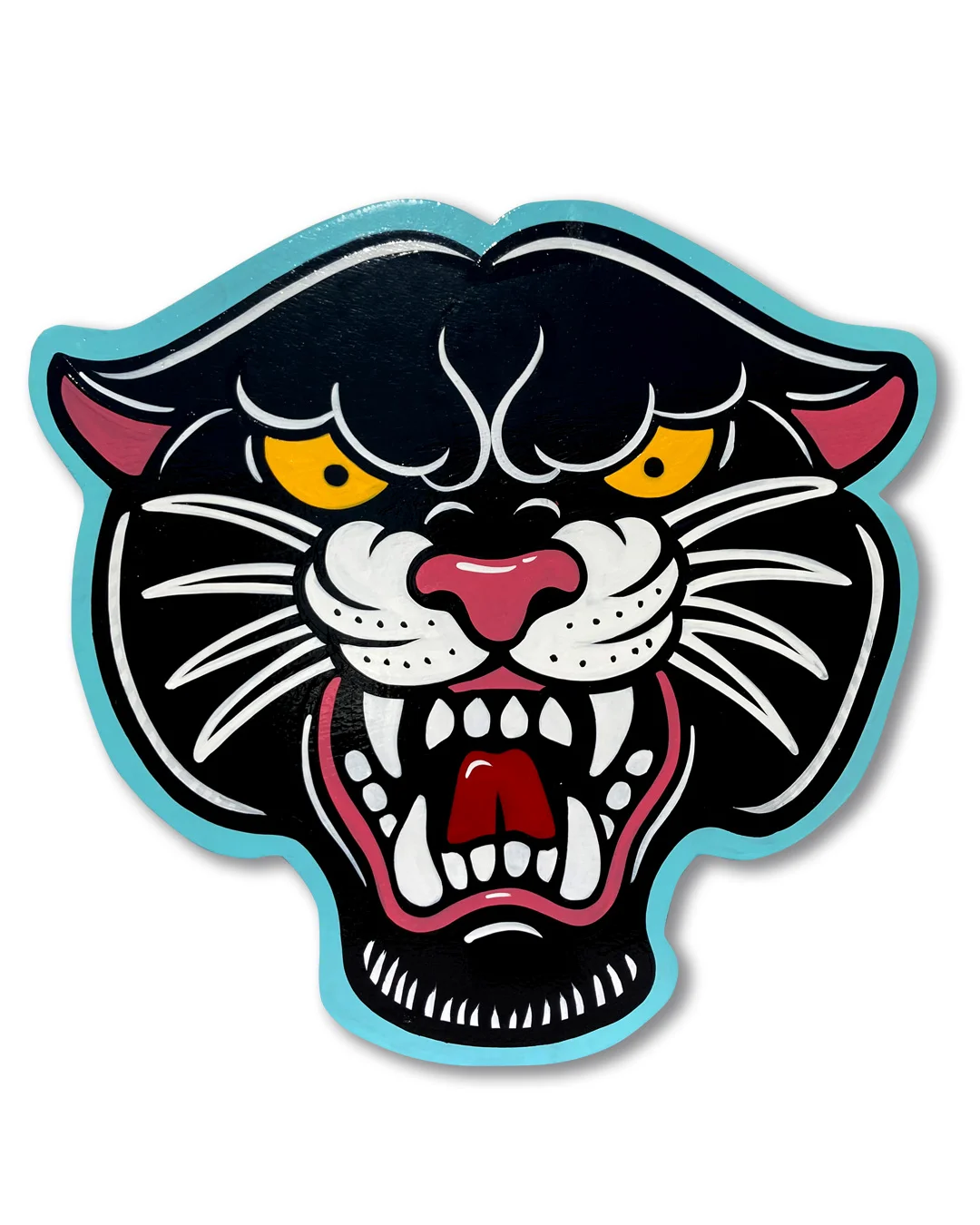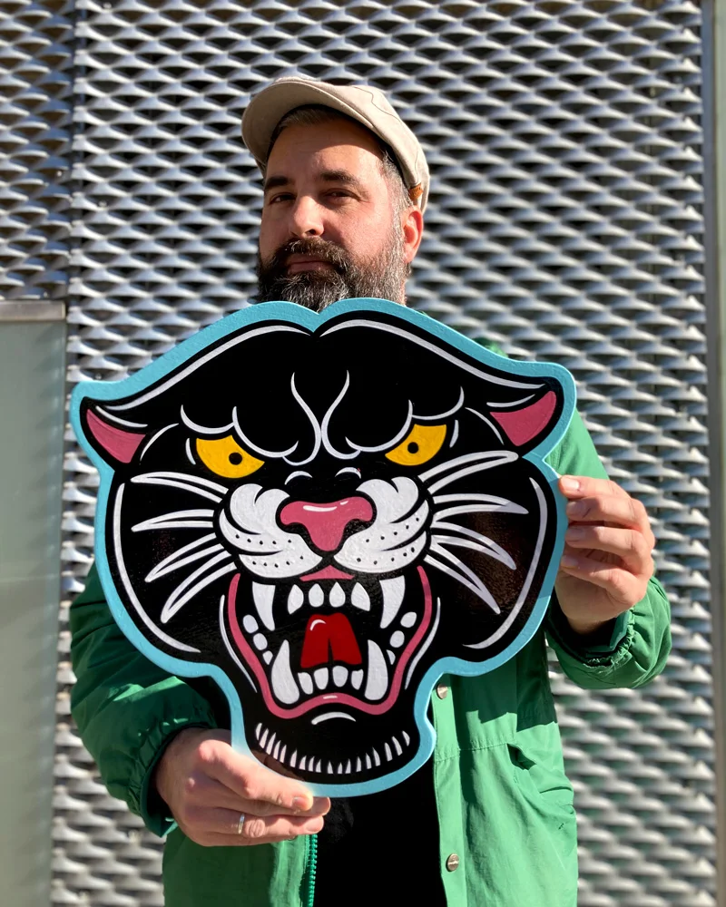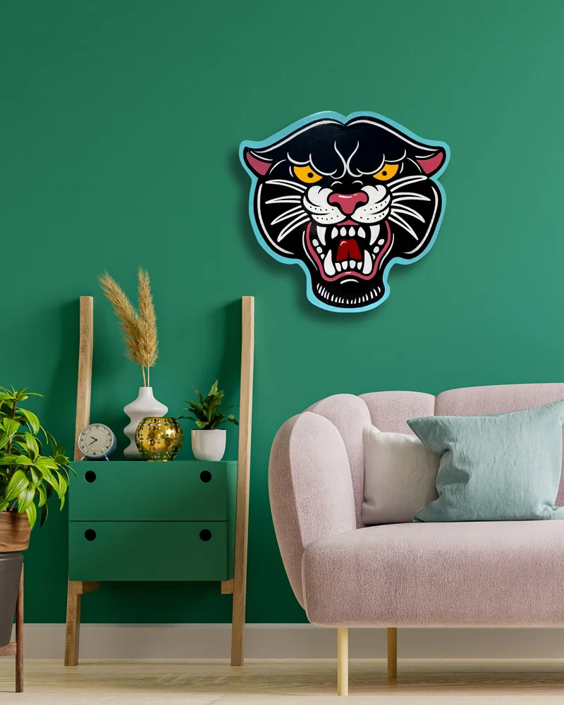 Letrero Pantera Tattoo tradicional pintado a mano con pincel sobre madera contrachapada de 1cm con las medidas 41cm de alto x 44cm de ancho.