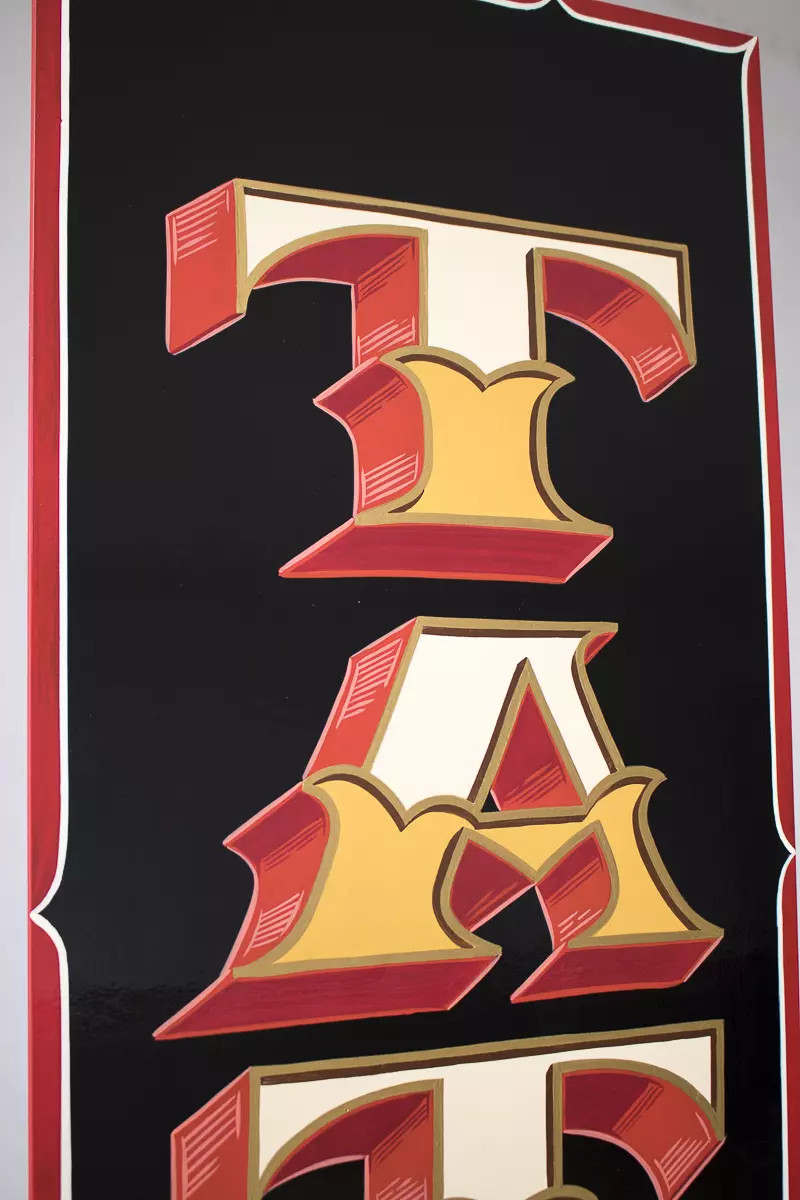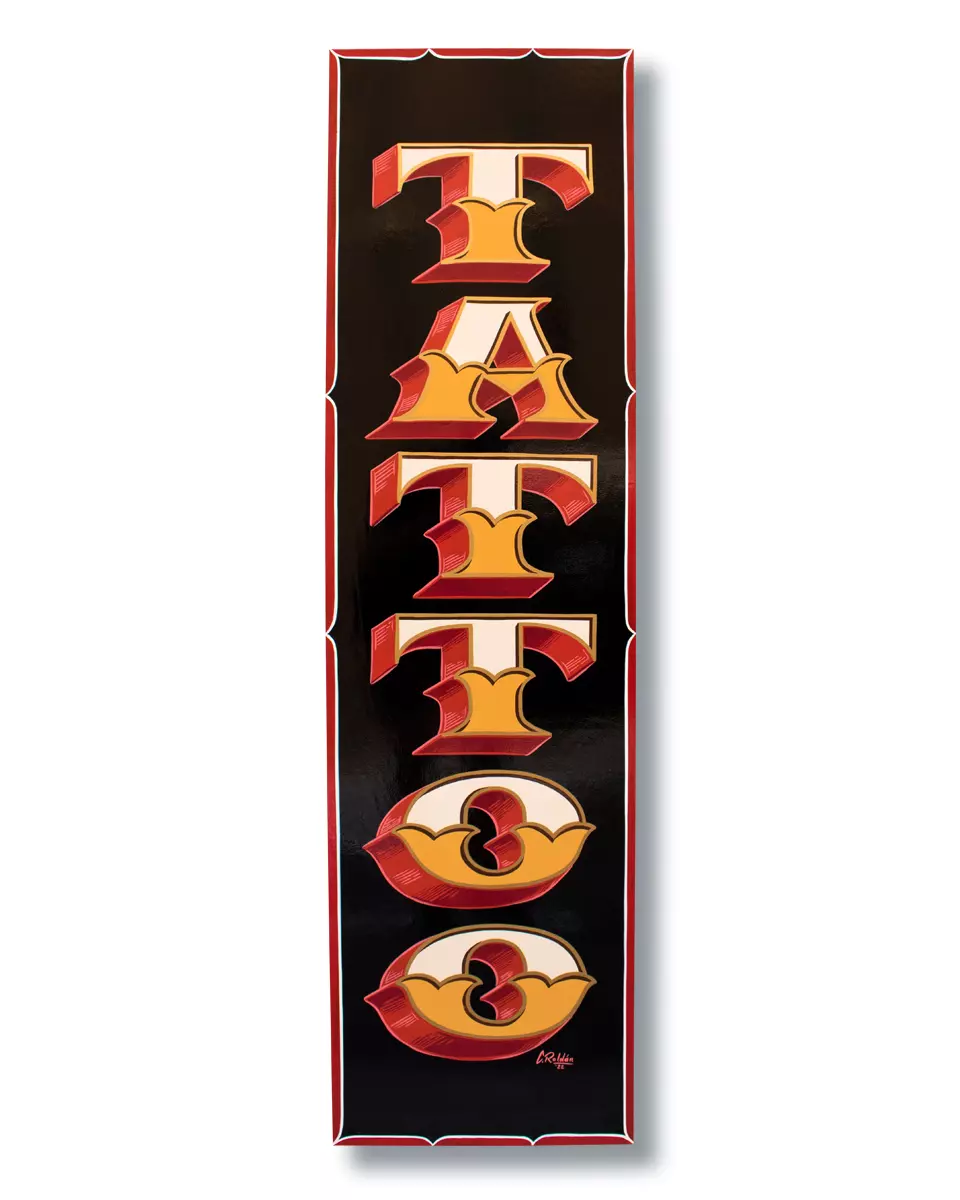 La madera tiene 10mm de espesor y cuenta con dos manos de pintura en color negro. El trabajo de rotulación tradicional con la palabra Tattoo en color imitación de oro y blanco con un sombreado en color rojo brillante.