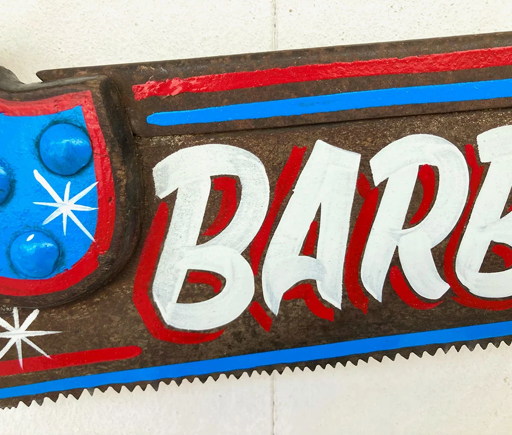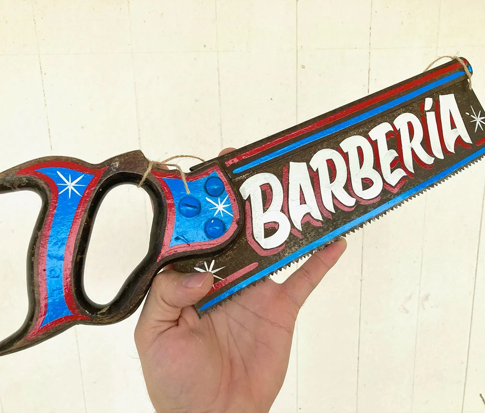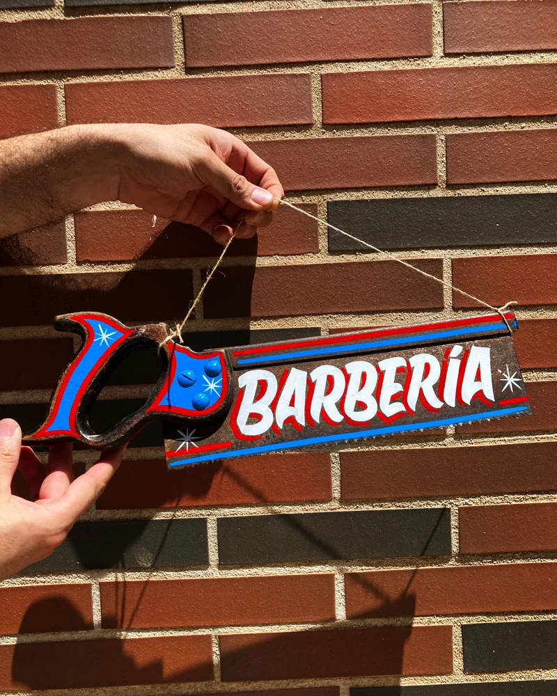Este serrucho estilo americano con lettering barbería está listo para colgar y ser enviado.