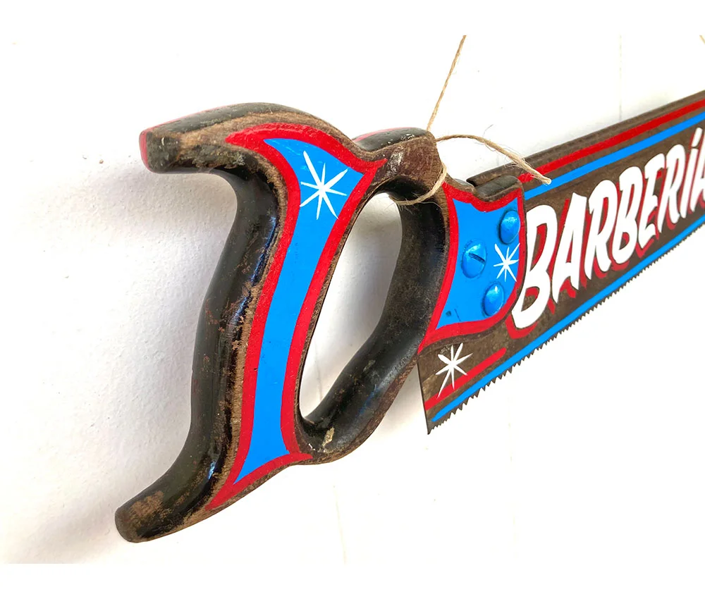 Este flamante serrucho de 43cm x 15cm con diseño exclusivo y único, esta pintado por una de sus caras con técnicas de rotulación tradicional, a pincel y pulso, utilizando la tipografía Casual y los colores clásicos de una barbería azul, rojo y blanco.